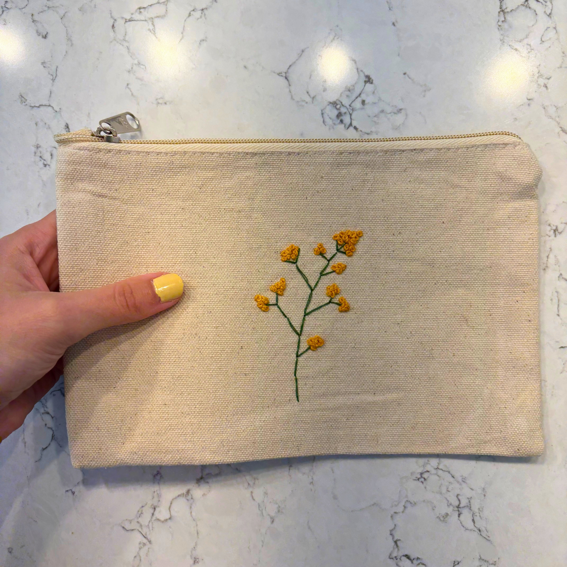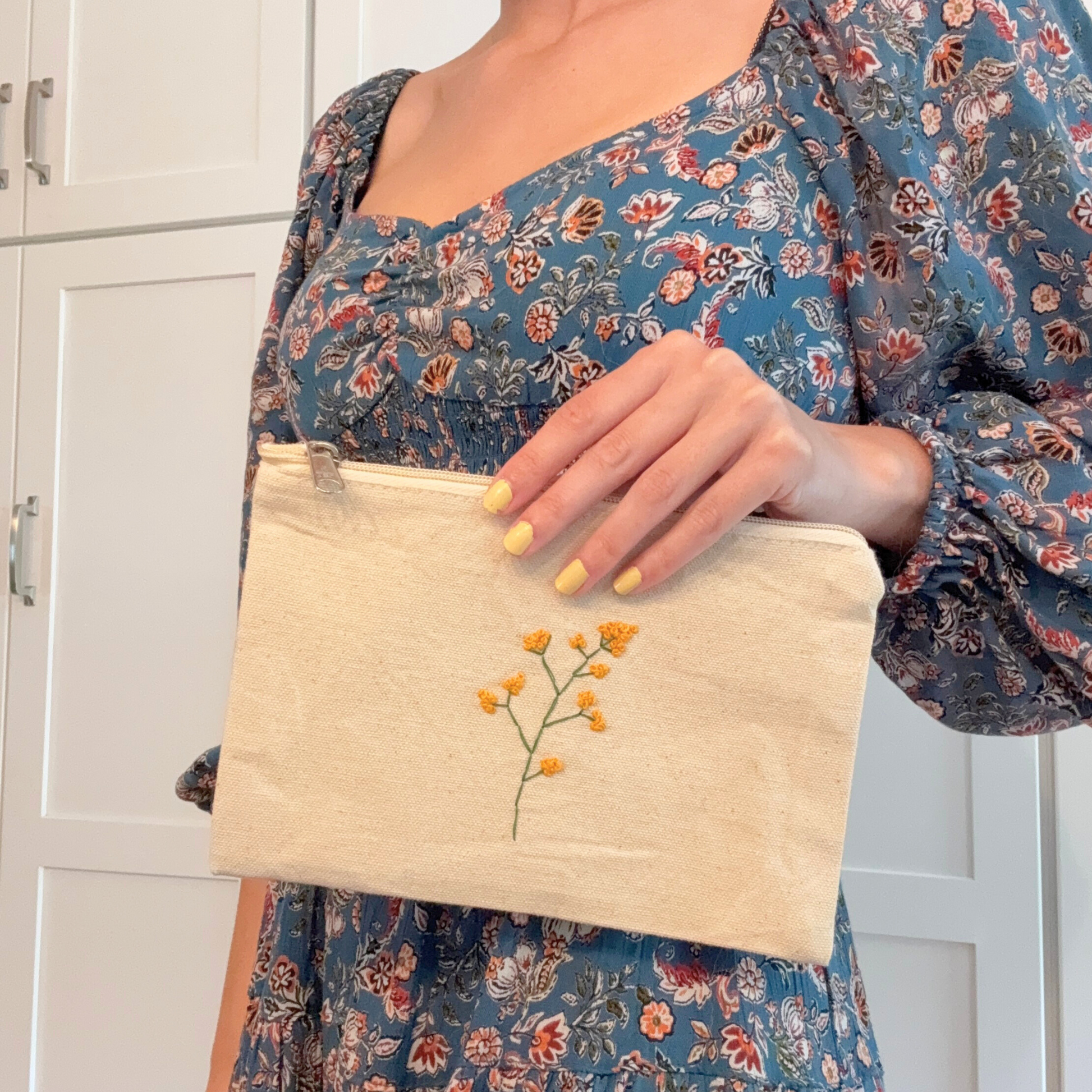 Crafted from heavyweight natural canvas, this 4.75 in × 6.75 in (12 cm × 17 cm) clutch is roomy enough for your phone, cards, keys, and lipstick yet slim enough to slip into a larger tote. A minimalist single‑flower motif is stitched completely by hand with premium color‑fast embroidery thread, so every blossom has its own unique character.
